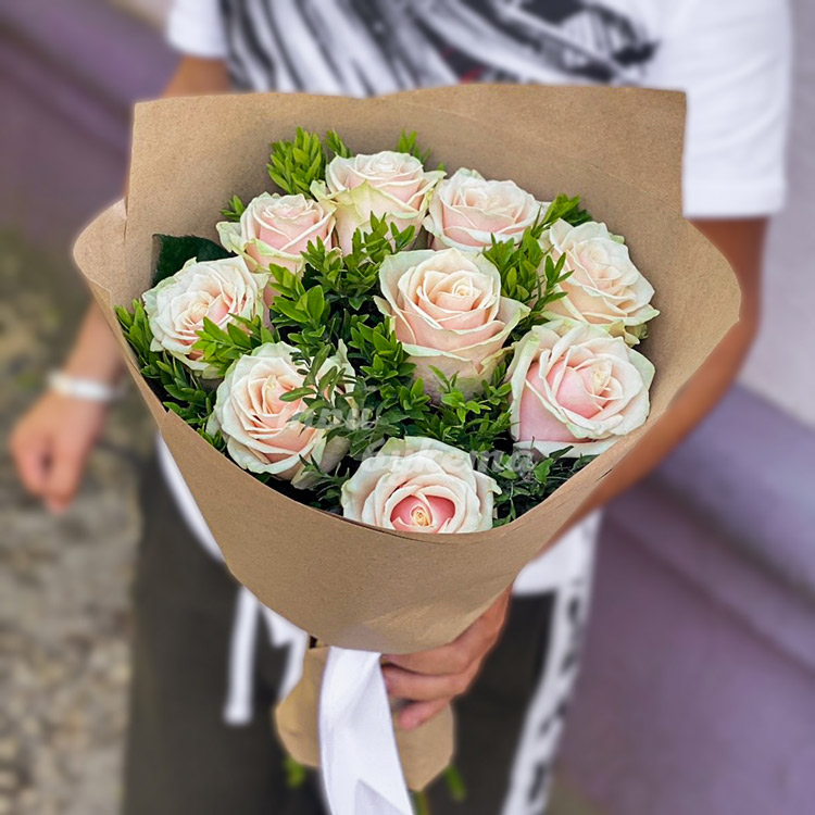 9 персиковых роз в крафте
