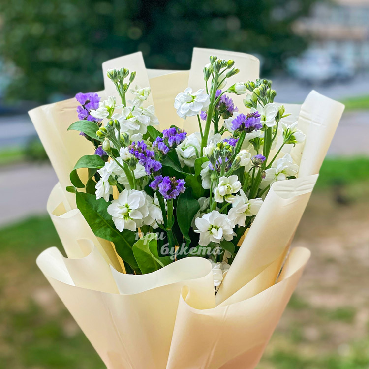 Букет 5 белых маттиол со статицей