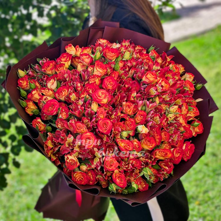 Букет из 51 куст. розы и альстромерии
