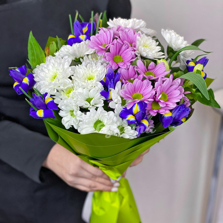Букет из цветных хризантем и ирисов