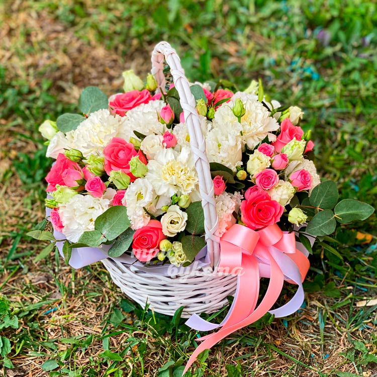 Корзина белых эустом и розовых роз