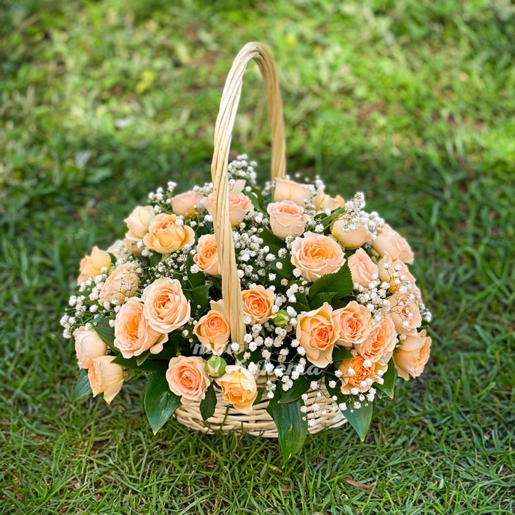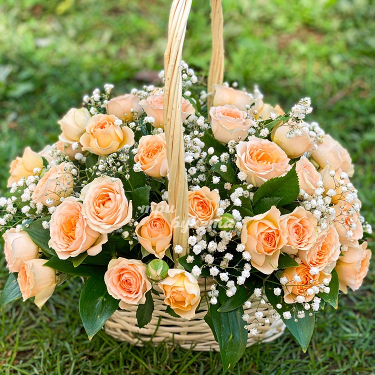 Корзина кремовых кустовых роз с гипсофилой