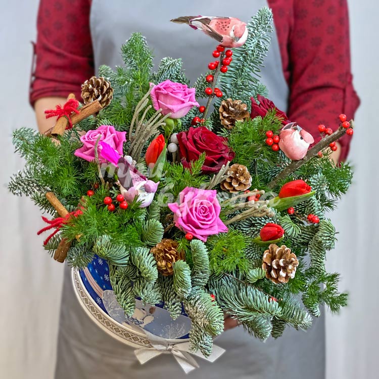 Праздничная композиция из роз и хвои